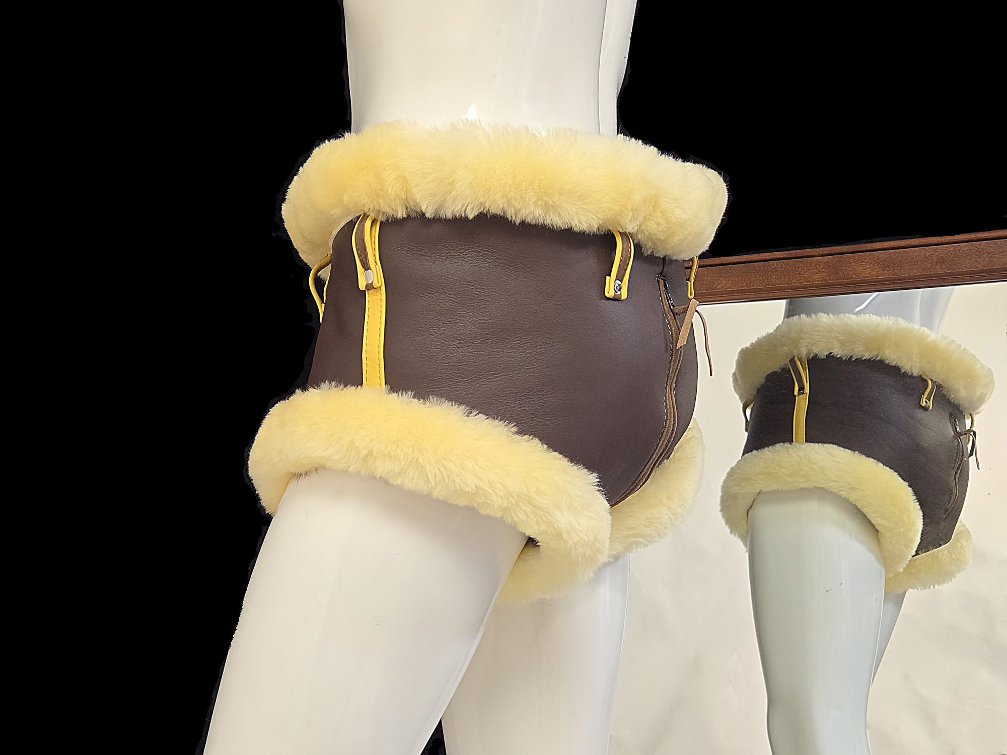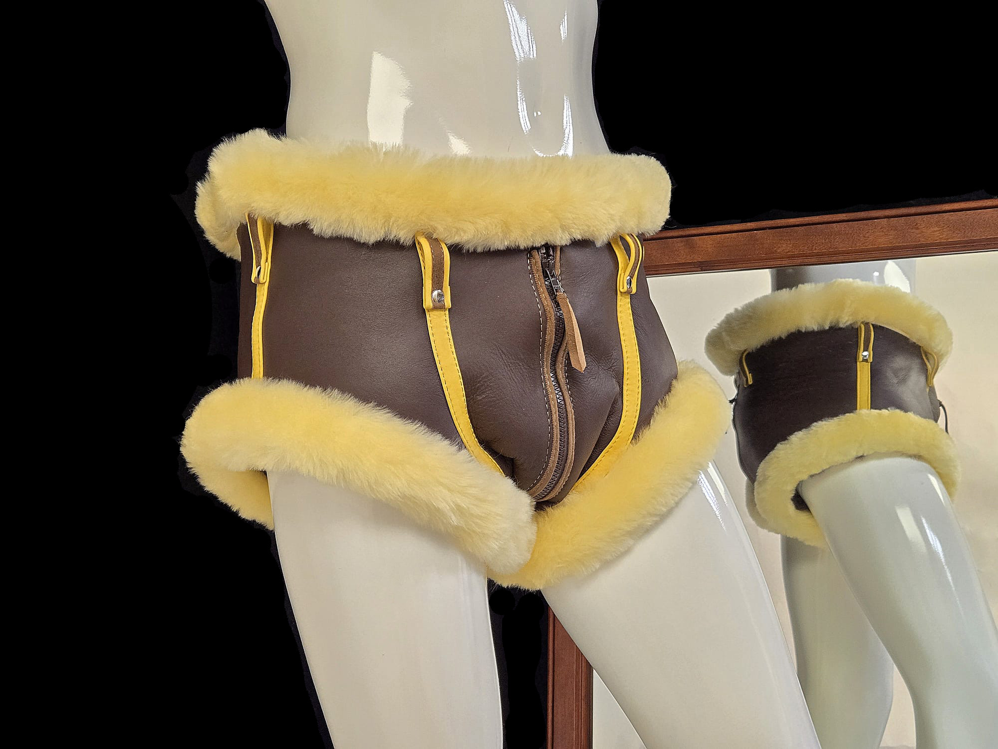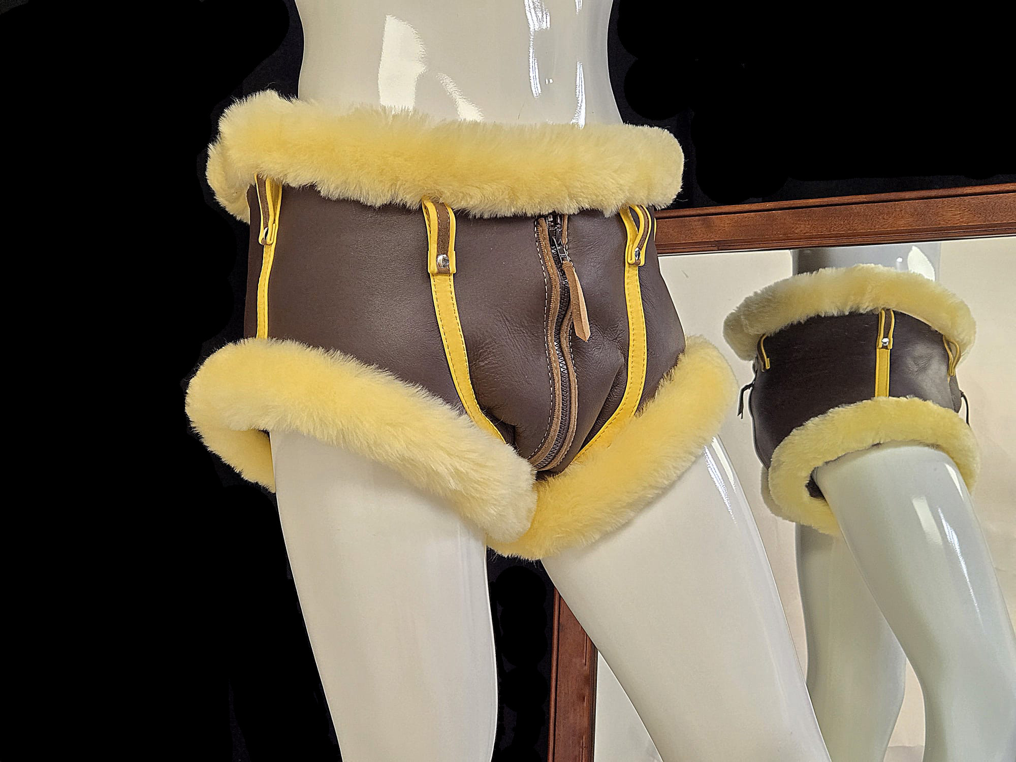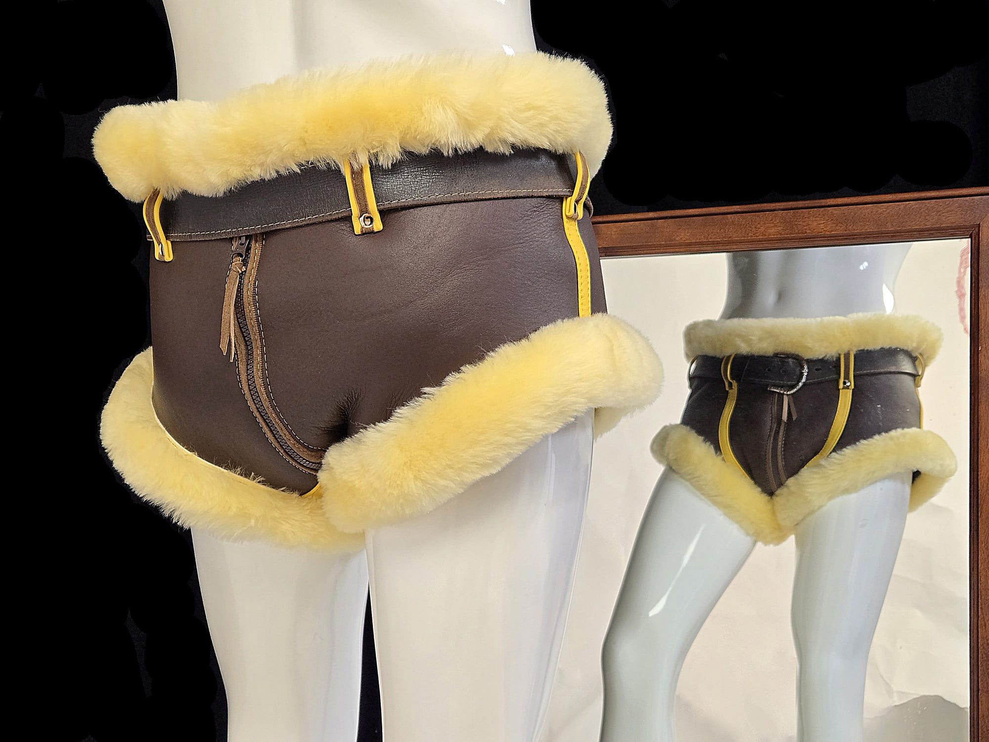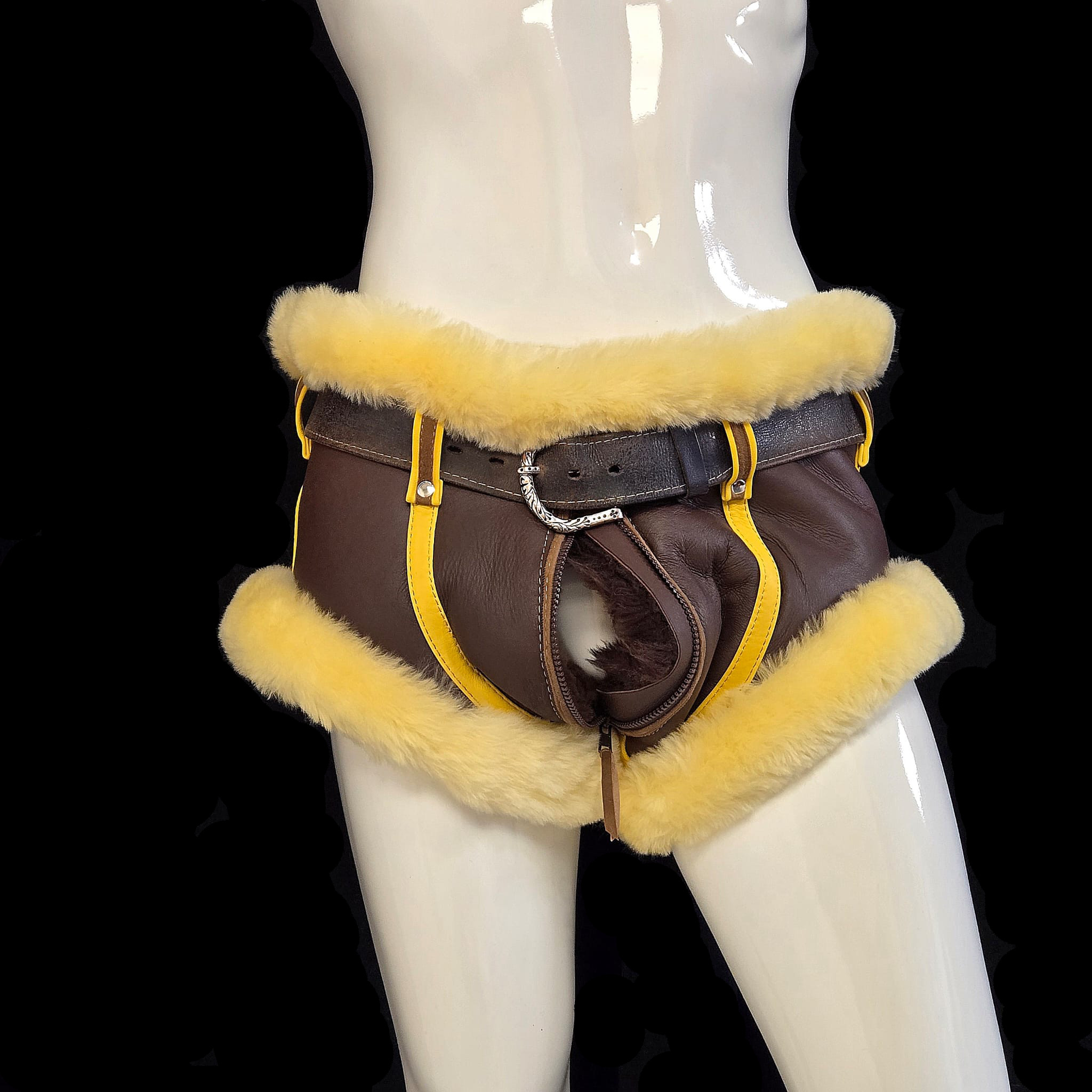 Fully custom fur leather underwear. Cut, coverage, fur placement, hardware — everything is built to your exact specifications and ideas.